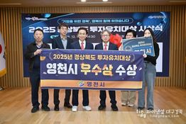 파이낸셜대구경북 기자 | 영천시는 19일 경상북도청에서 열린 ‘2025년 경상북도 투자유치대상 시상식’에서 우수상을 수상했다고 밝혔다. 이번 시상식은 경상북도가 지난 1년간(2024년 11월 ~ 2025년 10월) 도내 시·군의 투자유치 활동 실적을 평가하고, 투자유치에 기여한 기업과 시·군을 격려하기 위해 마련됐다. 영천시는 해당 기간 동안 기업 투자유치를 위한 행정 지원과 유치 활동을 추진했으며, ㈜카펙발레오와 1,600억원 규모의 투자양해각서(MOU)를 체결하는 등 의미 있는 투자유치 성과를 기록했다. 이러한 실적과 함께 일자리 창출과 투자유치 시책 운영 등이 종합적으로 평가돼 우수상 수상으로 이어졌다. 이로써 영천시는 2023년부터 2025년까지 3년 연속 경상북도 투자유치대상 시상식에서 수상하며 꾸준한 투자유치 성과를 이어가고 있다. 시 관계자는 “이번 수상을 계기로 앞으로도 투자유치와 일자리 창출을 위한 노력을 지속해 나가겠다”고 밝혔다. 영천시는 앞으로도 지속적인 투자유치 활동을 통해 지역 산업 기반을 확대하고, 양질의 일자리 창출과 지역 경제 활성화를 위해 힘쓸 계획이다