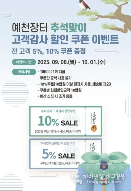 추석명절 특별판매기간 동안에는 전 회원에게 5%, 10%(10만원 이상 구매시) 할인쿠폰을 지급하며, 품목별로 업체별 할인을 시행하여 5~30%에 이르는 할인 폭으로 예천군 우수 농‧특산물을 만나볼 수 있다.