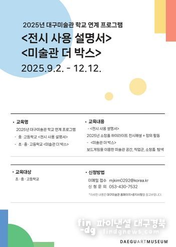 파이낸셜대구경북 이지원 기자 | 대구문화예술진흥원 대구미술관은 초·중·고 학생들의 문화예술 향유 기회를 확대하고, 융합적 사고와 창의적 역량을 키우기 위해 오는 9월 2일부터 12월 12일까지 2025년 하반기 학교 연계 교육프로그램을 운영한다.