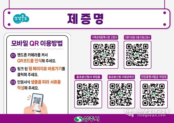 해당 민원서류 작성 예시는 상주시 홈페이지 누리집에도 게시되며, 종합민원실 및 읍면동에도 QR코드를 비치하여 누구나 쉽게 이용할 수 있도록 할 예정이다.