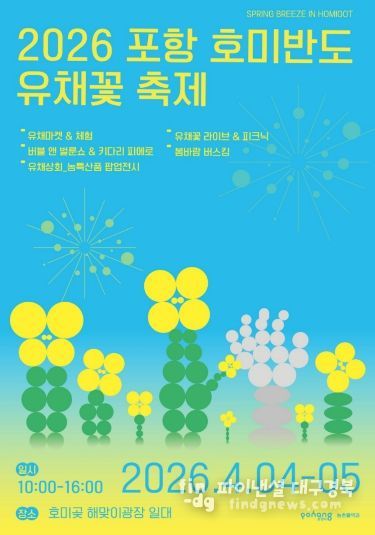 파이낸셜대구경북 기자 | 노란 유채꽃 물결이 일렁이는 봄을 맞아 포항을 대표하는 봄꽃 행사인 ‘2026 포항 호미반도 유채꽃 축제’가 내달 4일부터 5일까지 이틀간 호미곶 해맞이광장에서 개최된다.