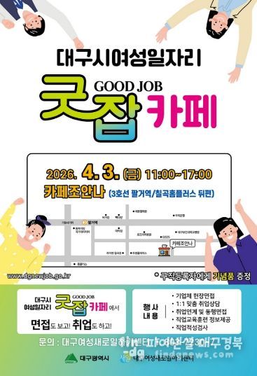 파이낸셜대구경북 김유신 기자 | 대구광역시는 취업을 희망하는 경력단절 및 미취업 여성을 위해 4월 3일 오전 11시부터 북구 소재 ‘카페 조안나(칠곡점)’에서 올해 첫 ‘찾아가는 여성일자리 굿잡(Good Job)카페’를 개최한다.