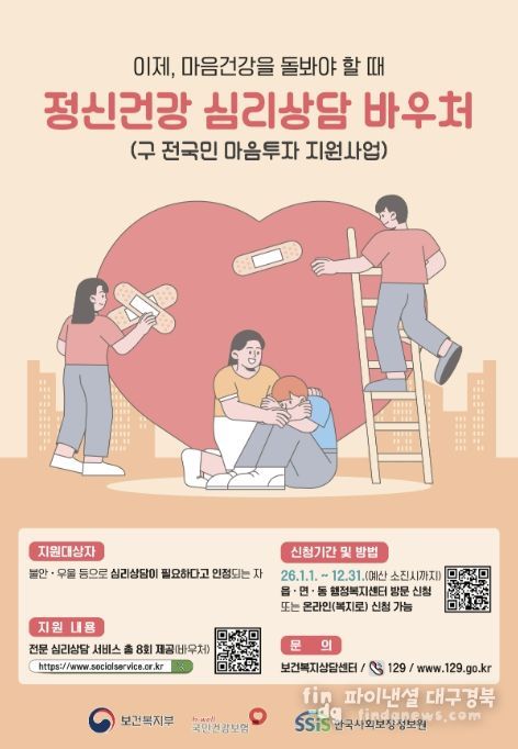 파이낸셜대구경북 기자 | 예천군은 우울·불안 등 정서적 어려움을 겪는 군민을 위해 ‘정신건강 심리상담 바우처’ 사업을 운영하고 있다.