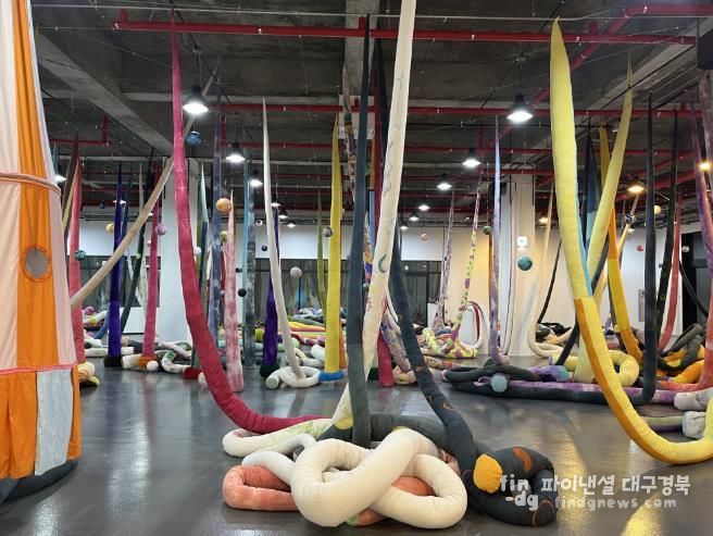 전시장 곳곳에 패브릭 소재로 된 미술 작품이 배치되어 관람객이 마치 숲 속을 거닐 듯 우주와 우주 사이를 이동하며 작품을 감상하고 체험할 수 있다.