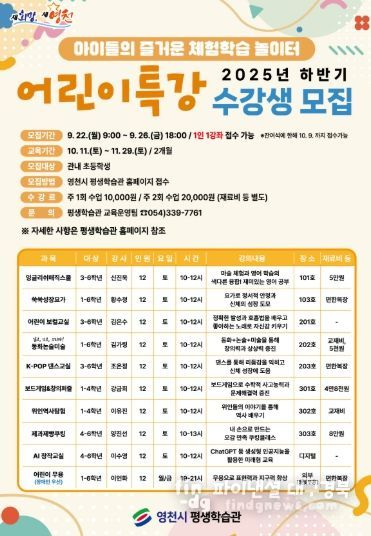 파이낸셜대구경북 이지원 기자 | 영천시 평생학습관은 22일부터 26일까지 관내 초등학생을 대상으로 ‘2025년 하반기 어린이특강’ 수강생을 모집한다.