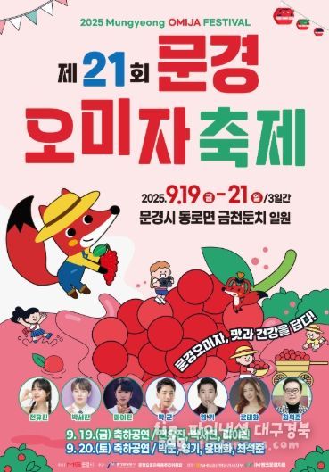 올해로 21회를 맞이하는 문경오미자축제는‘문경오미자, 맛과 건강을 담다!’라는 주제로 9월19일부터 21일까지 3일간 동로면 금천둔치에서 진행된다. 축제의 하이라이트인 개막식은 현역가왕 출신의 박서진, 전유진, 마이진 등 정상급 가수들의 축하 공연으로 특별한 밤을 선사하고, 20일에는 문경시 홍보대사인 박군, 영기, 주미 등이 분위기를 더욱 뜨겁게 달굴 예정이다. 폐막식이 열리는 21일에는 문경오미자 노래교실 경진대회를 비롯하여 박미영, 앵두걸스, 장혜진, 한혜정의 축하공연으로 축제 마지막 날 대미를 장식한다.