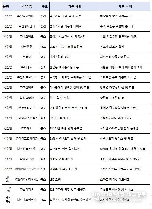 사업재편계획 승인기업의 주요 내용은 다음과 같다. ㈜고산테크는 고효율 태양전지 셀 시장에 진출하고, ㈜신성씨앤티는 수소플랜트의 수전해 핵심부품인 분리막을 국산화한다. ㈜로보라이프는 로봇제어기술을 활용해 수동휠체어에 탈부착이 가능한 이동보조로봇을 개발해 안전성과 편리성을 높이고, ㈜화신볼트산업은 고온 열처리 기술을 바탕으로 SMR 기자재 시장에 진출한다. ㈜에이치엘옵틱스는 실리콘카바이드 전력반도체를 균일하게 접합해 패키징의 불량률을 크게 줄이는 장비를 개발하고, ㈜삼일씨엔에스는 해상풍력발전용 기초구조물을 제작해 해상풍력 공급망을 강화한다.