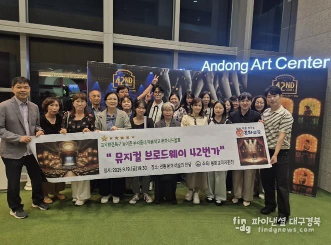 파이낸셜대구경북 금교광 기자 | 경상북도봉화교육지원청은 9월 19일, 2025 농어촌 우리동네 예술학교 운영 관리자 및 담당 교사들이 안동문화예술의전당에서 열린 뮤지컬 『브로드웨이 42번가』 공연을 관람했다고 밝혔다.