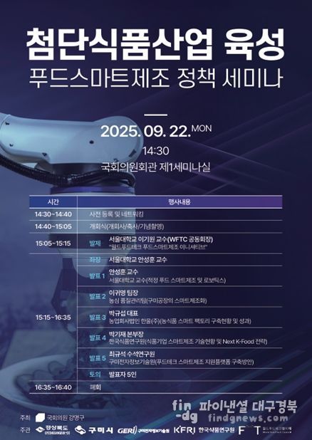 파이낸셜대구경북 신영숙 기자 | 경북도는 22일 국회의원회관 제1세미나실에서 강명구 국회의원과 공동으로 ‘첨단식품산업 육성 푸드 스마트제조 정책 세미나’를 개최했다.