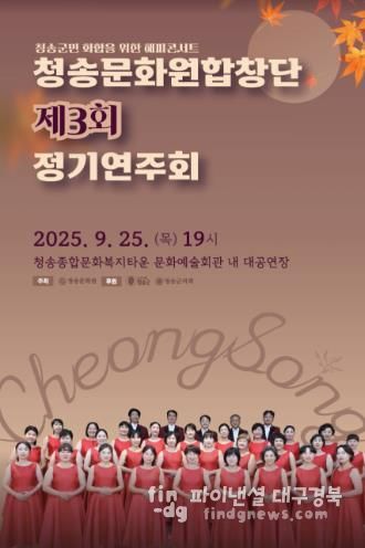 파이낸셜대구경북 강대산 기자 | 청송군은 오는 9월 25일 목요일 오후 7:00부터 청송문화예술회관 대공연장에서‘청송문화원합창단 제3회 정기연주회’를 개최한다고 밝혔다.