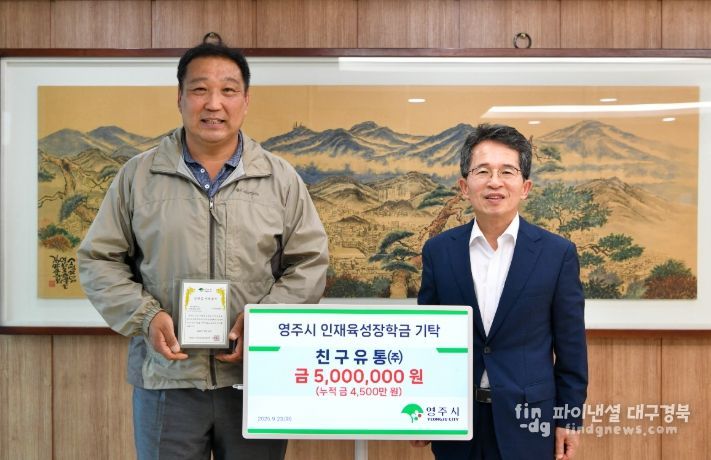 파이낸셜대구경북 강대산 기자 | 재)영주시인재육성장학회는 지난 23일, 친구유통㈜(대표 하원태)로부터 지역 인재 양성을 위한 장학금 500만 원을 기탁받았다고 밝혔다.