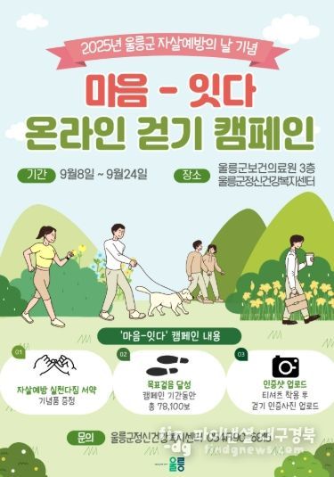 파이낸셜대구경북 신영숙 기자 | 울릉군정신건강복지센터는 경상북도 및 경북광역정신건강복지센터와 함께 9월 8일부터 9월 24일까지 운영한 '마음-잇다' 생명사랑 온라인 걷기 캠페인을 성황리에 마무리했다.