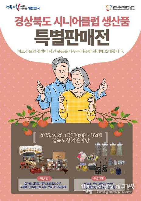 파이낸셜대구경북 이지원 기자 | 경상북도는 다가오는 추석 명절을 맞아 26일 도청 가온마당에서‘2025년 경상북도 추석맞이 노인일자리 생산품 특별판매전’을 개최한다.
