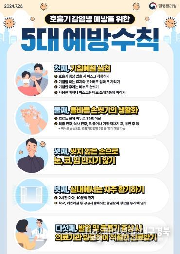 호흡기 감염병을 예방하기 위해서는 호흡기 증상 발생 시 마스크 착용, 기침 예절 실천, 올바른 손 씻기, 씻지 않은 손으로 눈‧코‧입 만지지 않기, 실내 환기 등 예방 수칙을 준수해야 한다.