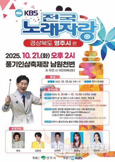 파이낸셜대구경북 이지원 기자 | 영주시는 오는 10월 21일 오후 2시, 풍기인삼축제장 남원천변에서 ‘KBS 전국노래자랑–영주시편’ 본선 녹화를 진행한다고 밝혔다.