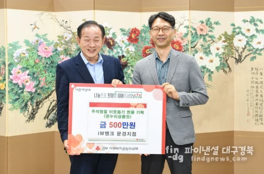 이영우 iM뱅크 문경지점장은 “작지만 따뜻한 마음을 담아 지역 이웃들에게 도움이 되고자 이번 기탁을 준비했다”며, “앞으로도 지역사회와 함께하는 나눔 문화 확산에 지속적으로 동참하겠다”고 전했다.