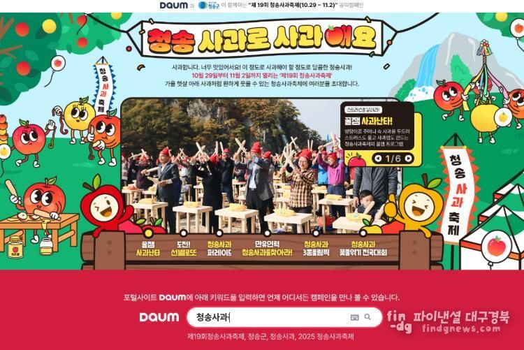 참여 방법은 ‘다음(daum)’ 포털사이트 검색창에 ‘청송, 청송군, 청송사과, 청송사과축제 등’을 검색하면 온라인 축제에 접속할 수 있다.