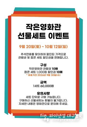 파이낸셜대구경북 이지원 기자 | 성주별고을시네마(창의문화센터 3층)는 민족 대명절 추석을 맞아 9월 20일부터 10월 12일까지 ‘추석맞이 선물세트 이벤트’를 진행한다.