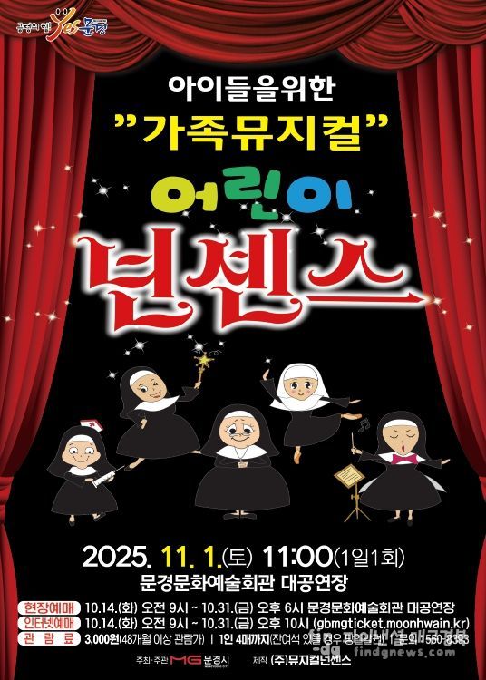 파이낸셜대구경북 이지원 기자 | 문화예술회관에서는 11월 기획공연으로 화끈하고 재미있는 수녀들의 이야기를 담은 뮤지컬 ‘어린이 넌센스’공연을 11월 1일 11:00에, 뮤지컬‘넌센스’공연을 11월 1일 17:00에 각각 문경문화예술회관 대공연장에서 진행한다.