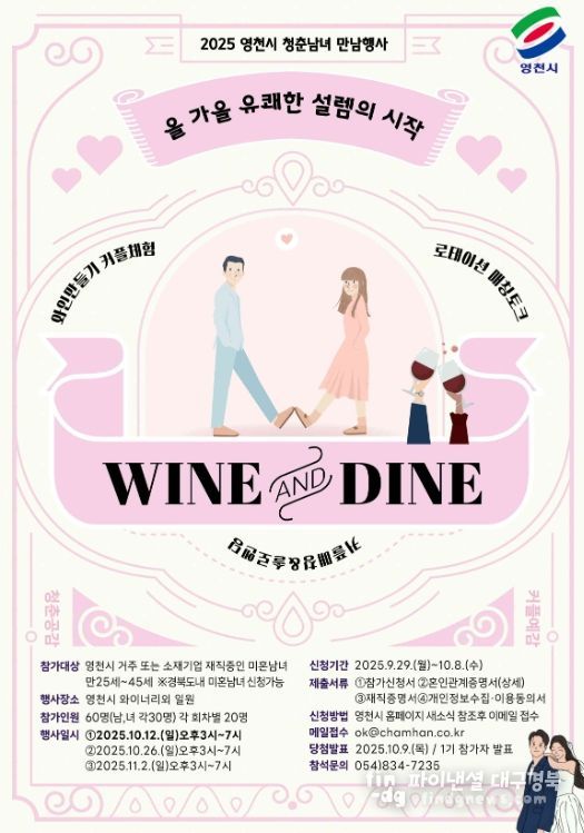 파이낸셜대구경북 이지원 기자 | 영천시는 오는 10월 12일, 10월 26일, 11월 2일 세 차례에 걸쳐 관내 와이너리에서 미혼남녀를 위한 특별한 만남 프로그램 ‘2025 영천愛 와인·다인(wine·dine)’을 개최한다.