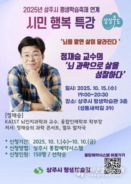 파이낸셜대구경북 이지원 기자 | 상주시 평생학습원은 2025. 10. 15. 오후 7시부터 8시30분까지 상주시 평생학습관 3층 강당에서 뇌과학자이자 미래학자인 정재승 KAIST 교수를 초청하여 특별 강연을 진행한다.
