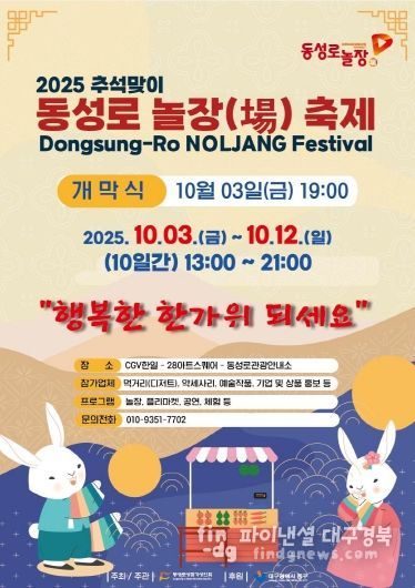 파이낸셜대구경북 이지원 기자 | 대구 중구는 10월 3일부터 12일까지 10일간 동성로 보행자전용도로 일원에서 ‘동성로에서 놀며 장보자!’라는 테마로 ‘2025 추석맞이 동성로 놀장(場) 축제’를 개최한다.