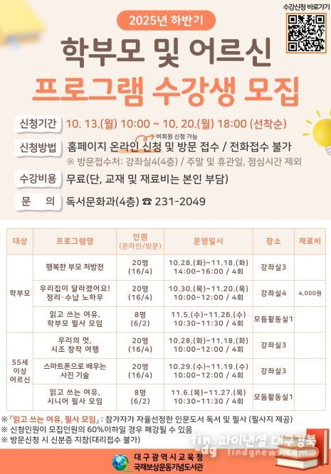 어르신 대상으로는 ▲시조를 이해하고 창작해 보는 ‘우리의 멋, 시조 창작 여행, 스마트폰 카메라 활용법’, ▲사진 편집 방법을 익힐 수 있는 ‘스마트폰으로 배우는 사진 기술’ 프로그램을 운영한다. 또한, ▲학부모 및 어르신 대상 자율 선정한 인문도서를 필사하는 ‘읽고 쓰는 여유, 필사 모임’을 진행한다.