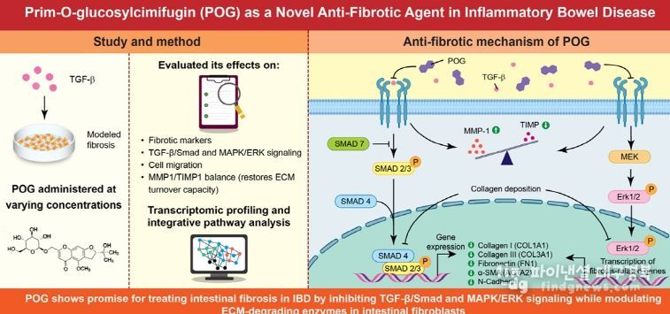 연구진들은 장 섬유화(Intestinal fibrosis) 진행을 억제하는 새로운 치료전략이자 천연물 유래 성분 ‘Prim-O-glucosylcimifugin(POG)’의 기능을 밝혀냈다.