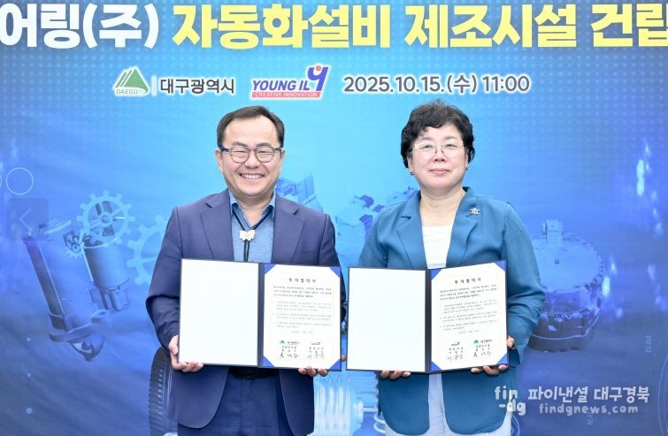 파이낸셜대구경북 김유신 기자 | 대구광역시는 10월 15일 대구시청 산격청사에서 영일엔지니어링㈜(대표 이창은)과 금호워터폴리스 내 ‘전기차 부품 자동화설비 제조시설’ 건립을 위한 투자협약을 체결했다.