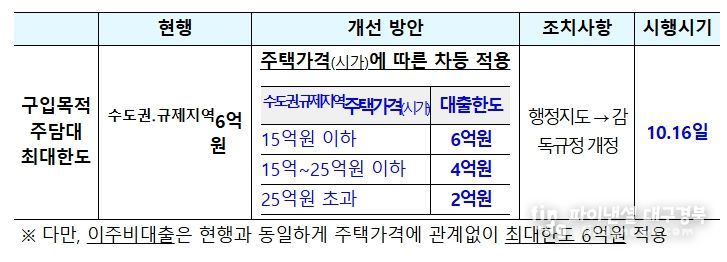 수도권·규제지역에 적용되는 주택구입목적 주담대의 대출한도(現 6억원)를 주택가격(시가) 수준에 따라 차등 적용한다. 수도권 · 규제지역의 ➊시가 15억원 이하 주택의 주담대 한도는 현행과 동일한 6억원, ➋시가 15억원 초과~25억원 이하 주택은 4억원, ➌시가 25억원 초과 주택은 2억원으로 대출한도를 차등 적용한다. 이를 통해 수도권·규제지역 내에서 대출을 활용한 고가주택 구입 수요를 보다 강력하게 관리해 나갈 예정이다.