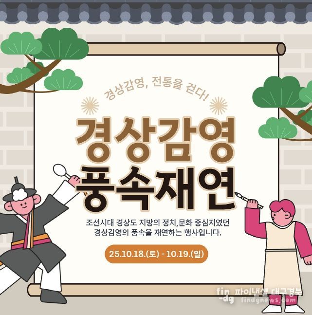 파이낸셜대구경북 김유신 기자 | 대구광역시는 10월 18일부터 19일까지 이틀간 경상감영공원 일원에서 관아의 옛 의식과 전통공연을 선보이는 ‘2025 경상감영 풍속재연’ 행사를 개최한다.