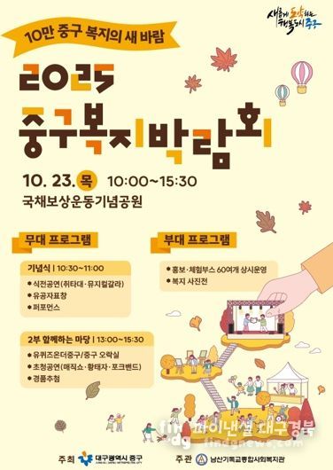 파이낸셜대구경북 김유신 기자 | 대구 중구는 오는 10월 23일 중구 국채보상운동기념공원에서 2025 중구 복지박람회를 개최한다고 밝혔다.