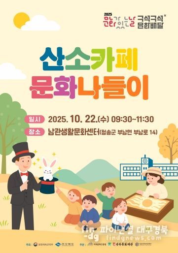 파이낸셜대구경북 기자 | (재)청송문화관광재단은 오는 10월 22일과 11월 25일 청송군 부남면 남관생활문화센터에서 2025 문화가 있는 날 '구석구석 문화배달' 사업의 일환으로 ‘산소카페 문화나들이’ 행사를 개최한다.