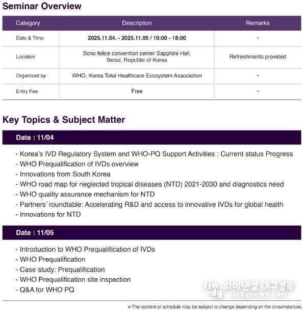 파이낸셜대구경북 기자 | 식품의약품안전처는 세계보건기구(WHO)의 사전적격성심사(PQ)팀과 공동으로 11월 4일부터 5일까지 서울 소노펠리체 컨벤션센터에서 국내 체외진단의료기기 제조업체의 해외 조달 시장 진출을 지원하기 위한 세미나를 개최한다고 밝혔다.