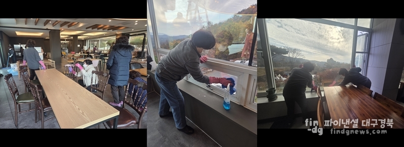 이날 봉사팀은 최근 공사로 어수선했던 청춘산장 2층 카페를 중심으로 창틀, 바닥, 테이블, 의자 등 집기류를 구석구석 쓸고 닦았다.