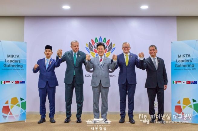 파이낸셜대구경북 김유신 기자 | 주요 20개국(G20) 정상회의 참석을 위해 남아프리카공화국을 방문한 이재명 대통령은22일(현지시간) 오후 우리나라, 멕시코, 인도네시아, 튀르키예, 호주 5개국으로 구성된 믹타(MIKTA) 회원국 정상들과 회동했다.