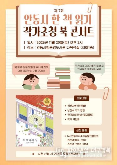 이번 행사는 안동시민들이 올해의 한 책을 함께 읽고 소통하는 문화 조성을 위해 마련된 것으로, 2025년 올해의 선정 도서인 ‘또 하나의 집’ 저자인 남찬숙 작가를 직접 만나 책의 배경과 집필 과정, 메시지 등을 깊이 있게 들을 수 있는 자리로 꾸며진다.