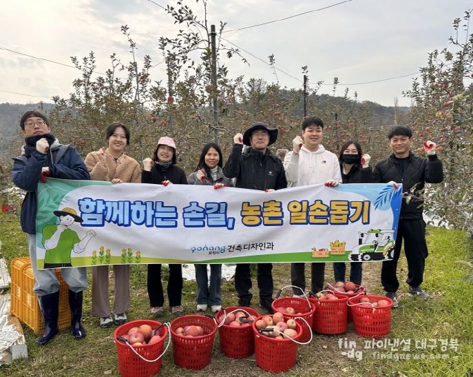 지난 25일 포항시 건축디자인과 직원 10여 명은 송라면 중산리 소재 과수재배 농가를 방문해 과실 수확과 선별, 운반 작업을 함께하며 농가의 일손 부담에 힘을 보탰다.