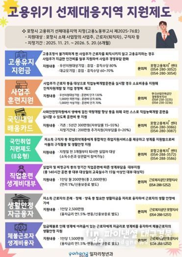이강덕 포항시장은 “이번 ‘고용위기 선제대응지역’ 지정을 계기로 산업과 고용위기에 직면한 지역 기업과 근로자에게 실질적인 도움이 돌아가도록 제도를 꼼꼼히 알리겠다”며 “유관기관과 긴밀히 협력해 고용유지와 생계안정 지원이 현장에서 체감될 수 있도록 행정력을 집중하겠다”고 말했다.