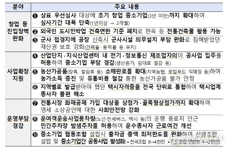 이번 방안은 경기 회복의 흐름이 민생현장의 지속가능한 성장과 도약으로 이어지도록, 중소기업과 소상공인이 사업운영 전반에서 체감하는 불합리한 규제애로를 선제적으로 개선하기 위해 마련됐다.