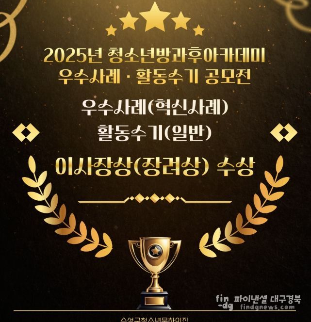 파이낸셜대구경북 김유신 기자 | 대구 수성구청소년문화의집 청소년방과후아카데미가 지난 28일 한국청소년활동진흥원이 주관한 ‘2025년 청소년방과후아카데미 우수사례(혁신사례)·활동수기(일반) 공모전’에서 각각 이사장상(장려상)을 수상했다고 밝혔다.