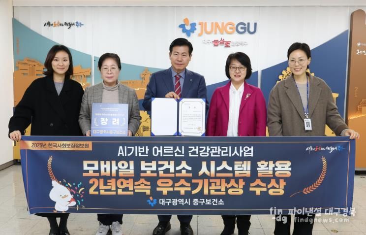 파이낸셜대구경북 김유신 기자 | 대구 중구보건소는 지난 18일 한국사회보장정보원이 주관한 ‘AI·IoT 기반 어르신 건강관리사업 모바일보건소 시스템 활용 평가’에서 2년 연속 장려상을 수상했다고 밝혔다.
