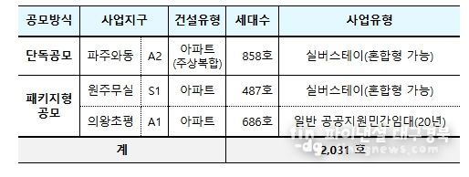 ②택지공모는 약 2천호 규모로 실시하며, 사업 대상지는 파주와동 A2 블록, 원주무실 S1 블록, 의왕초평 A1 블록 총 3곳이다. 파주와동 A2 블록과 원주무실 S1 블록은 실버스테이로, 의왕초평 A1 블록은 임대의무기간이 20년인 일반 공공지원민간임대로 공급한다.