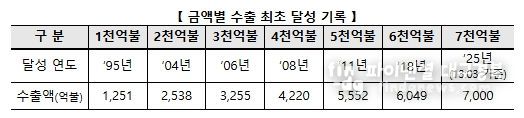 수출 7,000억 달러는 ‘18년도 6,000억 달러 달성 이후 7년만에 이뤄낸 쾌거로 전(全) 세계에서 6번째로 달성하며 수출강국 위상을 재확인했다. 특히, 6천억불은 7번째로 달성했으나, 7천억불은 6번째로 달성하며 우리 수출이 글로벌 주요국 대비 빠르게 성장하고 있음을 증명했다.