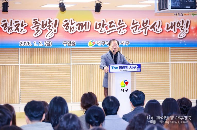 파이낸셜대구경북 김유신 기자 | 서구청은 1월 2일 2026년 병오년 시무식을 열고 새해 업무를 시작했다. 이날 시무식에서는 그간 추진해 온 도시 인프라 구축과 정주 환경 개선 사업의 성과를 공유하고, 구청장이 신년 덕담과 함께 올해 구정 운영 방향과 비전을 제시했다.