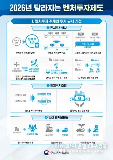 파이낸셜대구경북 기자 | 중소벤처기업부는 「벤처투자 촉진에 관한 법률」 및 하위법령(시행령, 시행규칙) 개정을 바탕으로 ’26년에 새롭게 달라지는 벤처투자 제도를 발표했다고 밝혔다.
