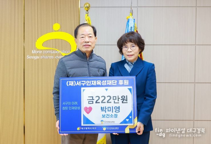 파이낸셜대구경북 김유신 기자 | 대구 서구청은 보건소 박미영 보건소장이 퇴임을 앞두고 지역 인재 육성을 위해 서구 인재육성재단에 222만 원을 기탁했다고 밝혔다.