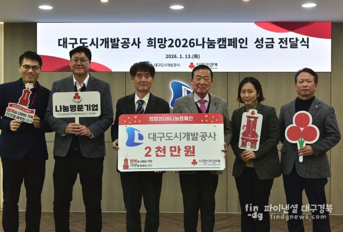 파이낸셜대구경북 김유신 기자 | 대구도시개발공사는 1월 13일 사회복지공동모금회가 주관하는 ‘희망2026나눔캠페인’에 성금 2,000만 원을 기탁했다고 밝혔다.