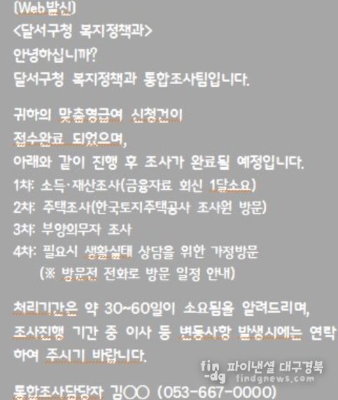 파이낸셜대구경북 김유신 기자 | 대구 달서구는 맞춤형 복지급여(생계·의료·주거·교육) 신청인을 대상으로 조사 진행 상황을 안내하는 ‘알림톡 서비스’를 2026년에도 확대 시행한다.