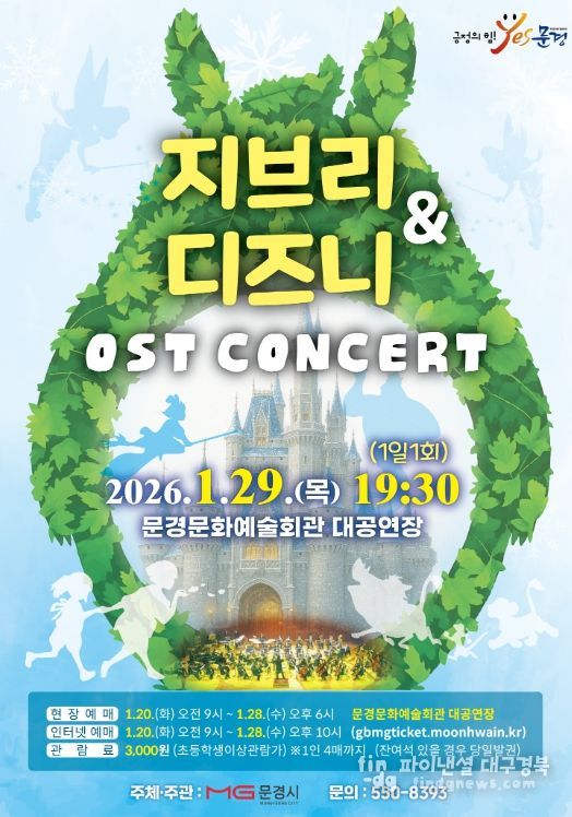 파이낸셜대구경북 기자 | 문경문화예술회관에서는 신년 겨울 방학을 맞아 인기 애니메이션 대표곡들을 들려주는 지브리 ·디즈니 OST 콘서트 공연을 1월 29일 19:30 (1일 1회)에 문경문화예술회관 대공연장에서 개최한다.
